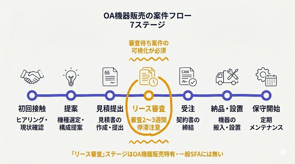 「リース審査」のステージがあるのは、OA機器販売ならではです。このステージで案件が2〜3週間停滞することも珍しくなく、審査待ちの案件を見落とさない仕組みが重要です。