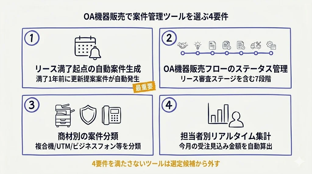 OA機器販売代理店が案件管理ツールを選ぶときは、以下の4要件で絞り込んでください。