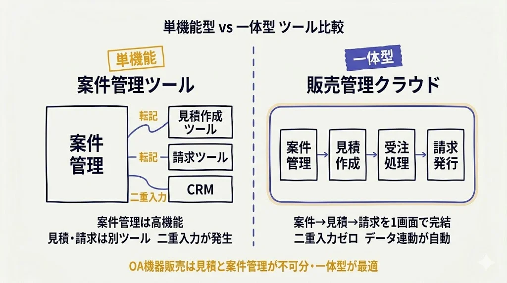 一体型の販売管理クラウドの選び方は「販売管理クラウドの選び方|OA機器販売代理店が失敗しない3つの判断基準」で詳しく解説しています。