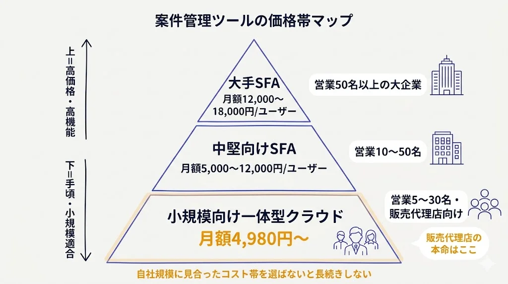 5〜10名のチームが大手SFAを導入すると、月額10万円以上の固定費が発生します。自社の規模に見合ったコストのツールを選ぶことが、長く使い続けるための前提です。