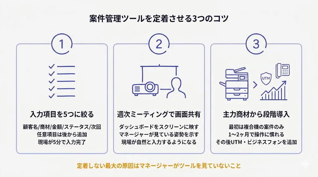 まずは複合機の案件だけをツールで管理し、1〜2ヶ月で操作に慣れたらUTM・ビジネスフォンの案件も追加する、という段階的なアプローチが確実です。