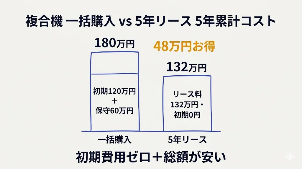 | 5年間総額 | 120万円 + 保守60万円 = 180万円 | 132万円 |