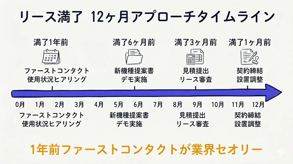 リース満了が近づくと、エンドユーザーは自ら情報収集を始めます。この段階で競合他社が先に提案していると、後から巻き返すのは困難です。