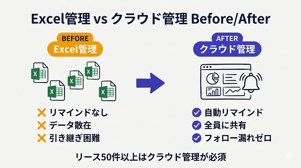 リース案件が50件を超えると、Excelでの管理は現実的ではなくなります。
