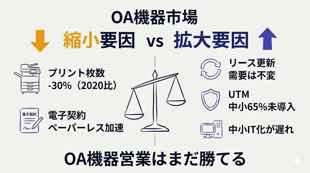 「OA機器の営業は時代遅れ」と言われることがあります。ペーパーレス化が進み、複合機の需要が減っている——確かにその側面はあります。