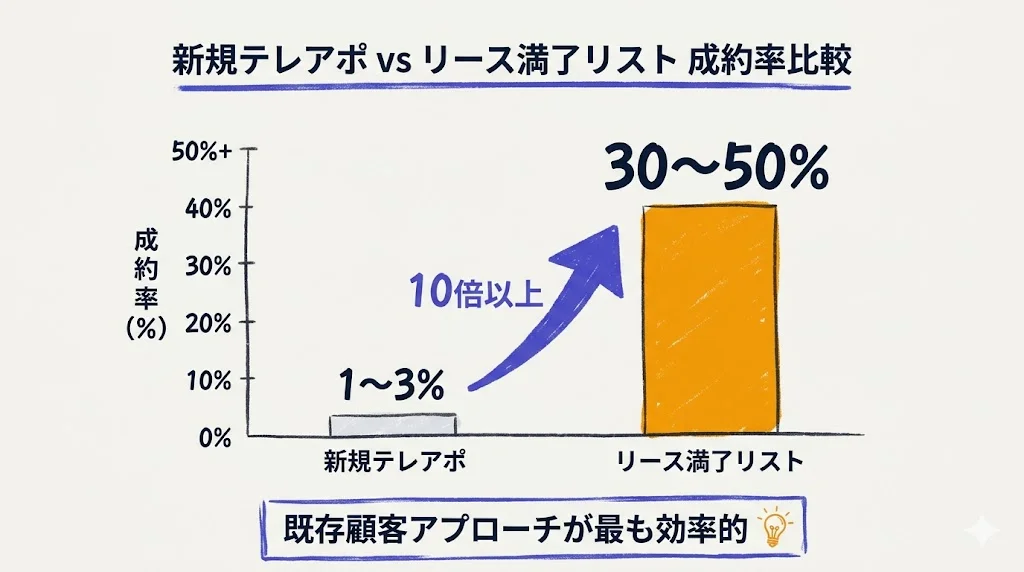 新規開拓のテレアポや飛び込みは、成約率が1〜3%と非常に低い手法です。一方、リース満了が近い既存顧客へのアプローチは、成約率が30〜50%に跳ね上がります。