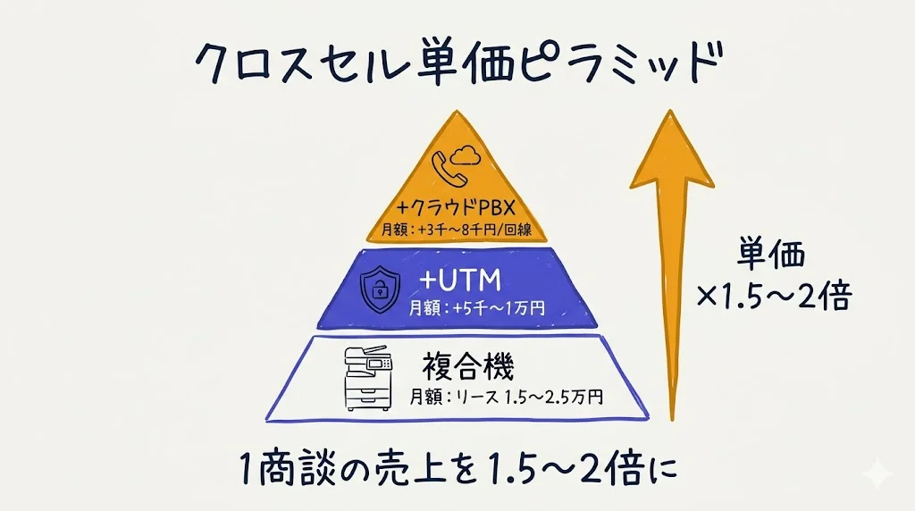 | クロスセル提案 | 複合機+UTM+PBXで1商談の売上を1.5〜2倍に |