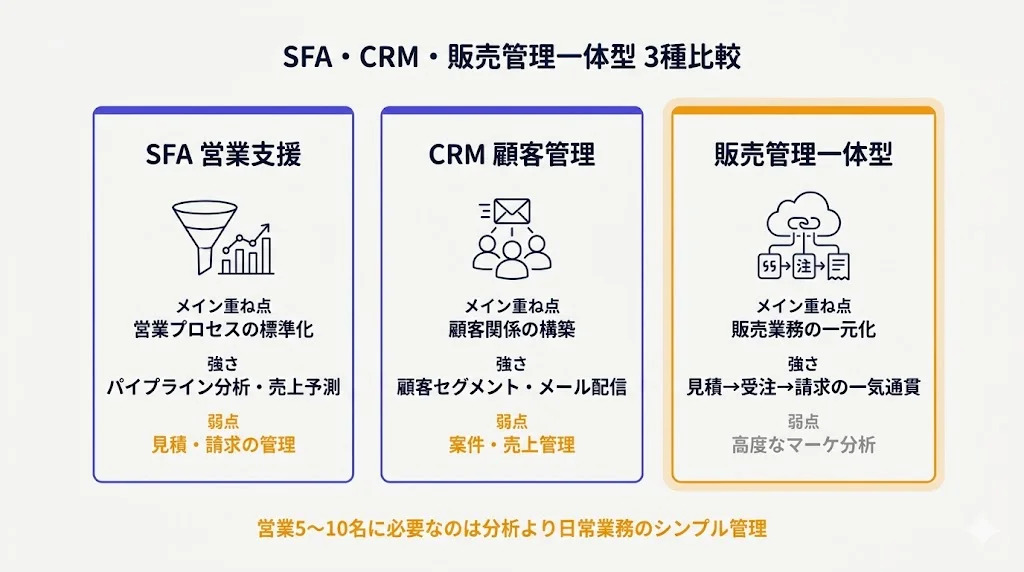 SFAとCRMの違いを詳しく知りたい方は「SFAとCRMの違いをわかりやすく解説|中小企業が本当に必要なのはどっち?」をご覧ください。