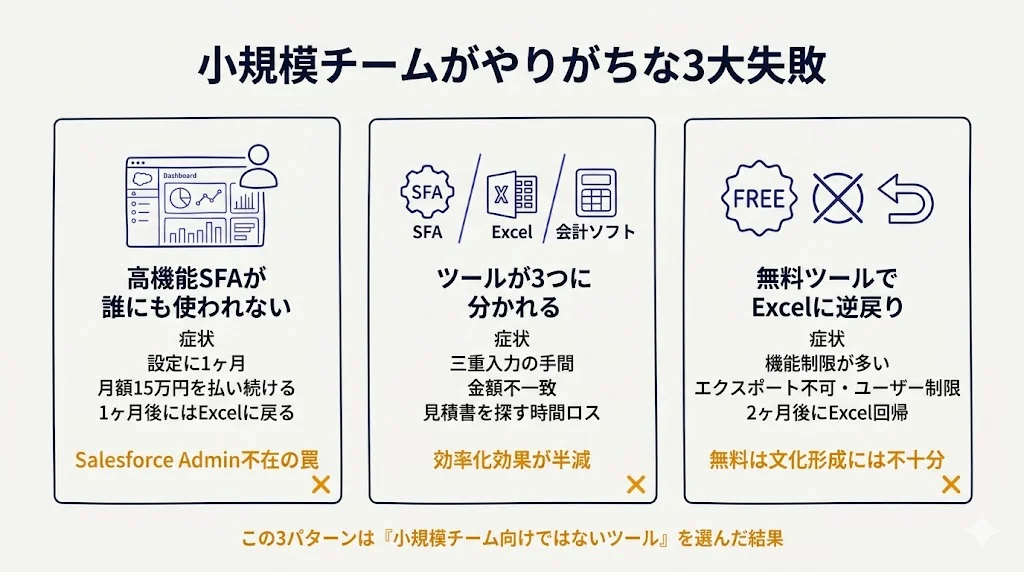 営業5〜10名の小規模チームが同じ基準でツールを選ぶと、高確率で失敗します。本記事では、小規模チームが陥りがちな3つの失敗パターンと、最初に導入すべき1本の選び方を解説します。