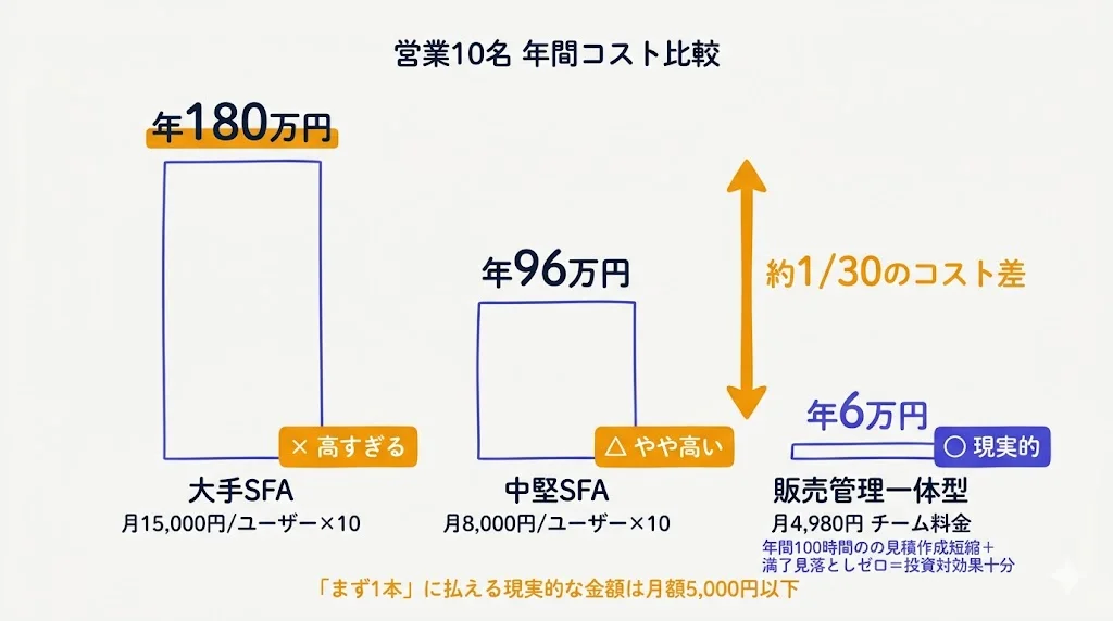 年間6万円の投資で、見積作成の時間短縮(年間100時間以上)、案件の見落としゼロ、売上のリアルタイム把握が実現できるなら、ROI(投資対効果)は十分です。