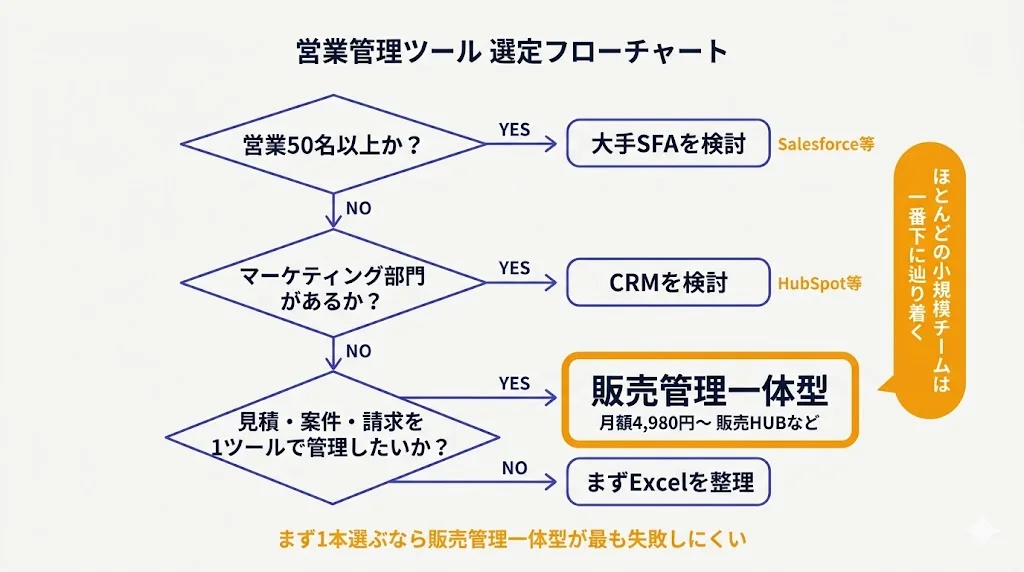 小規模チームの営業管理ツール選びで迷ったら、以下の判断フローで決めてください。