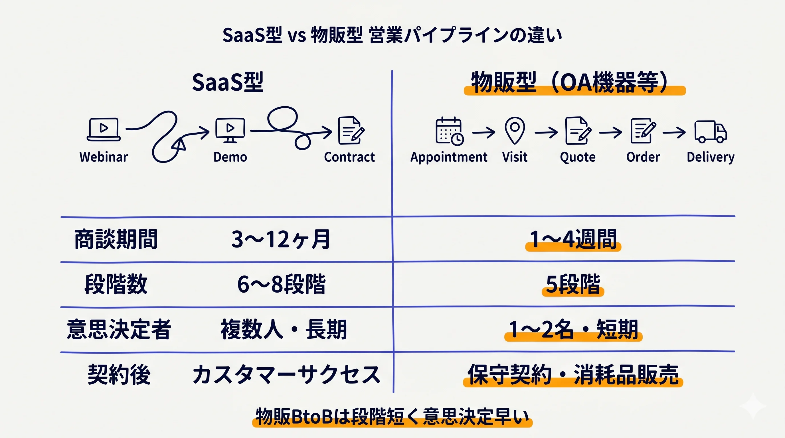 商談期間・段階数・意思決定プロセスが大きく異なります。SaaSは3〜12ヶ月の長期・8段階前後のパイプラインが主流ですが、物販BtoBは1〜4週間の短期・5段階が標準です。SaaS向けのツール・記事を物販にそのまま適用すると過剰設計になるため、業種特性に合わせた設計が重要です。