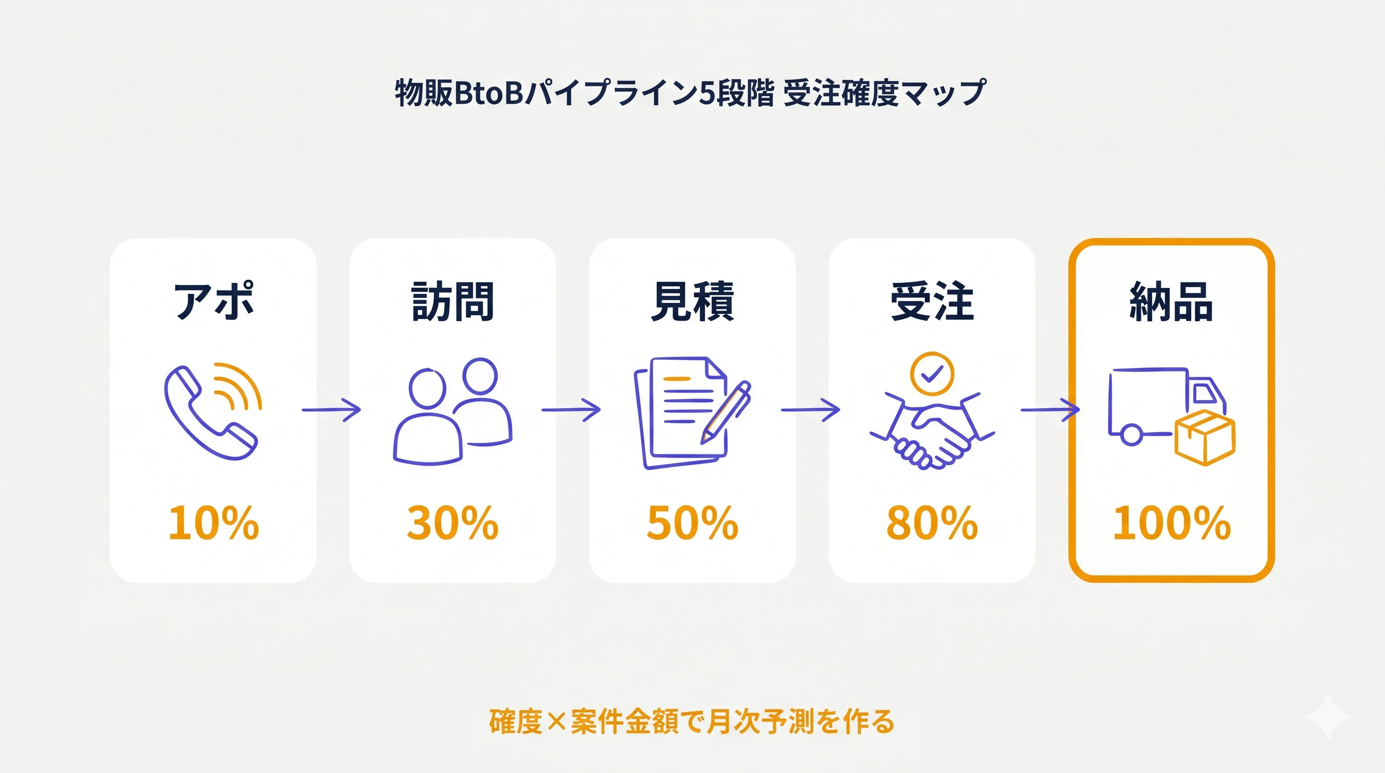 物販BtoBのパイプライン5段階(アポ→訪問→見積→受注→納品)