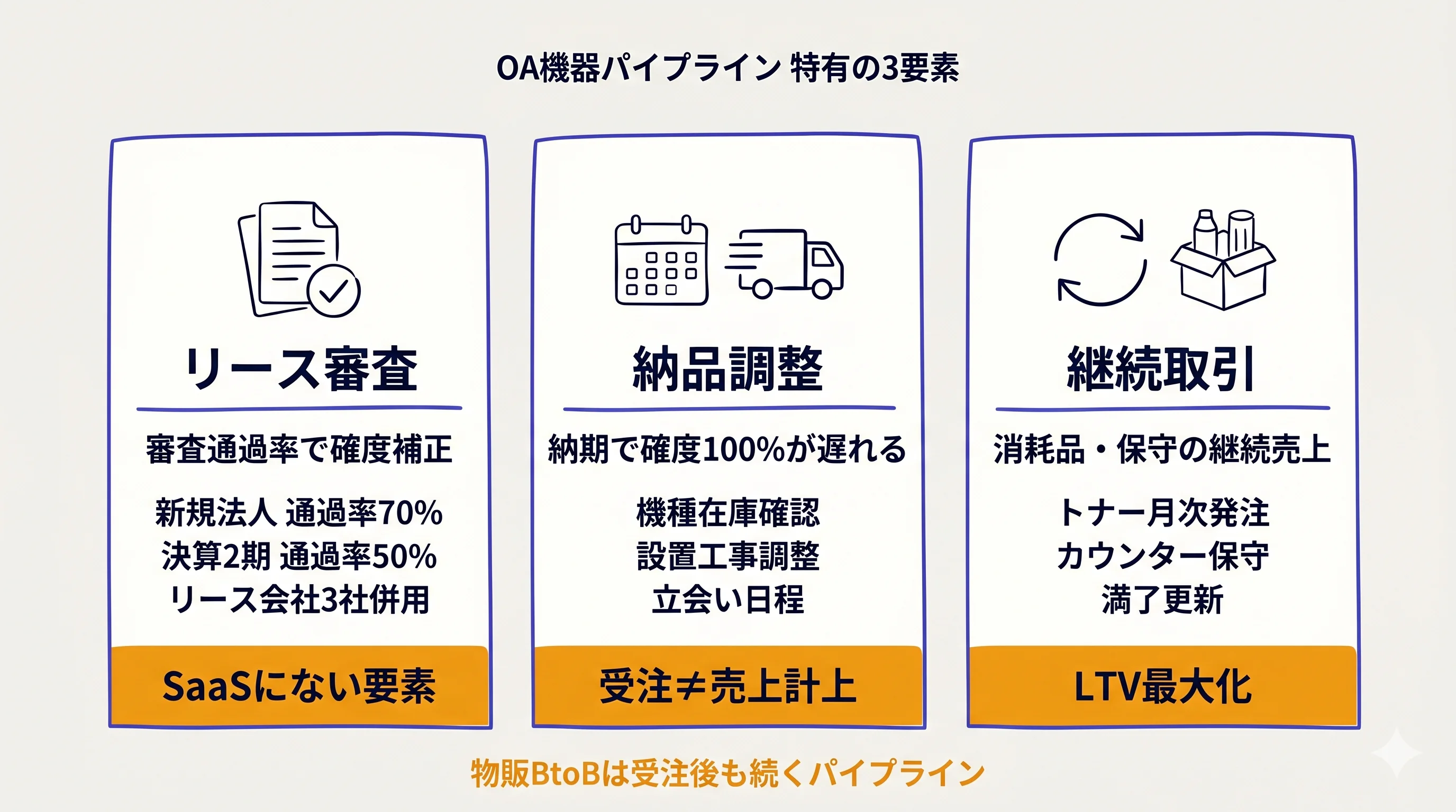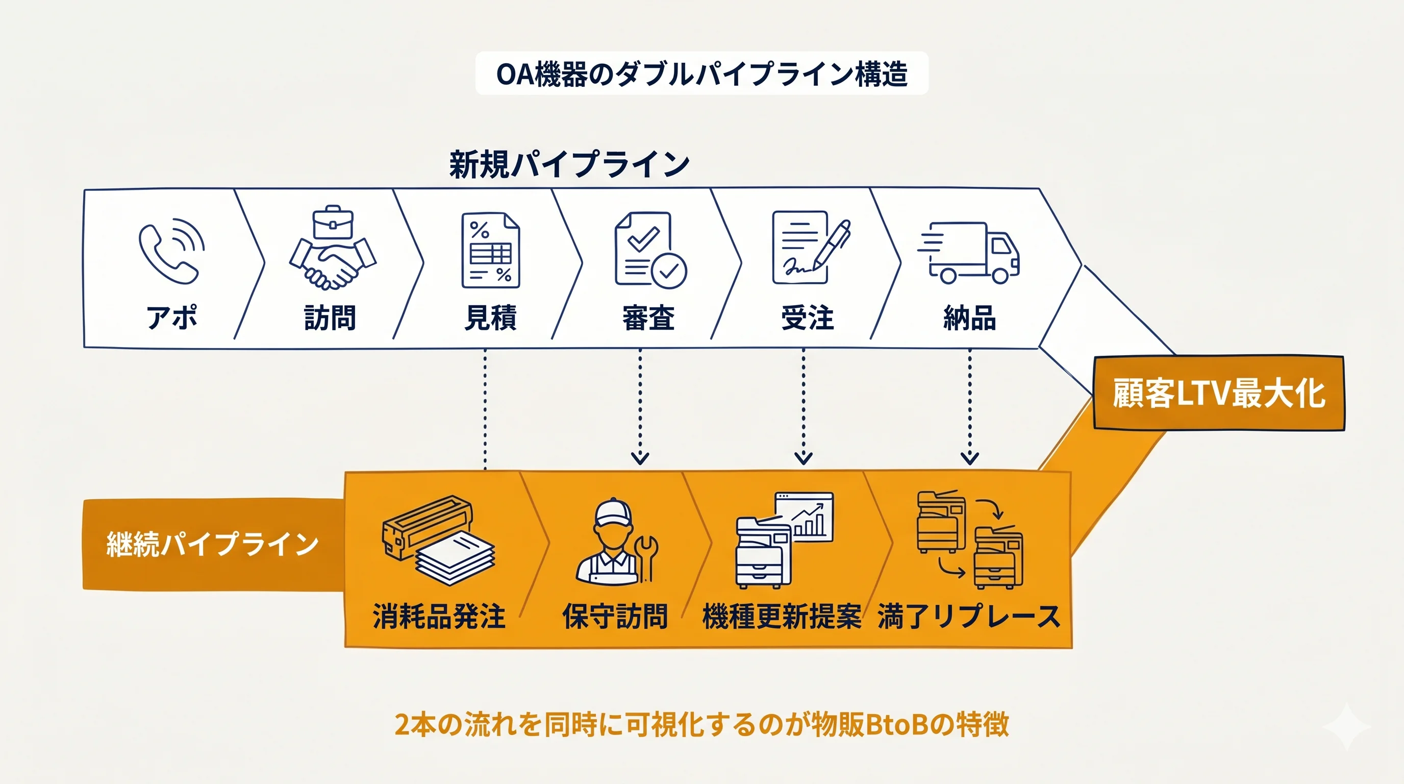 納品後の保守契約・トナー消耗品販売は継続取引のパイプラインとして独立管理する必要があります。「1回売って終わり」ではなく、満了6ヶ月前から更新提案パイプラインを発動する二重構造がOA機器代理店の営業の本質です。
