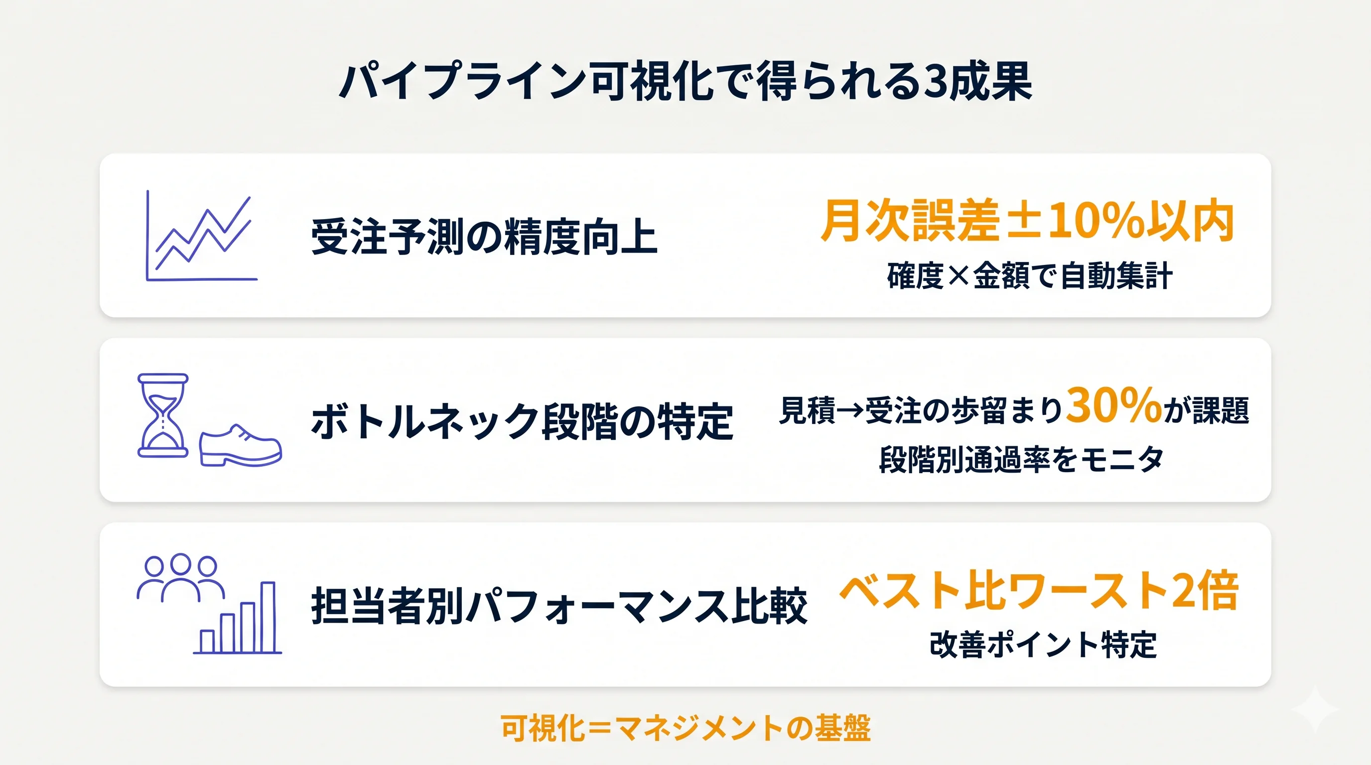 目的は3つに集約されます。1つ目は受注予測の精度向上、2つ目はボトルネック段階の特定、3つ目は担当者別のパフォーマンス比較です。月末の慌ただしい売上確認を、日常業務の中で自然に把握できる状態に変えるのがゴールです。