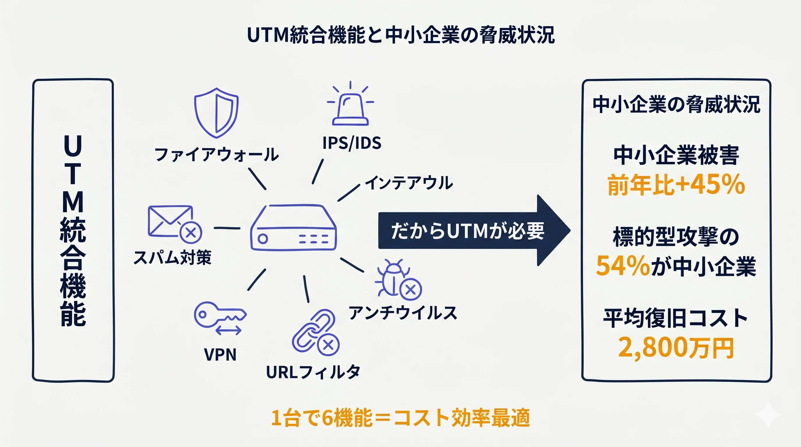単機能製品を複数導入するのではなく、1台に統合することで導入・運用コストを抑えるのがUTMの価値です。中小企業向けは月額1〜3万円のクラスが一般的です。