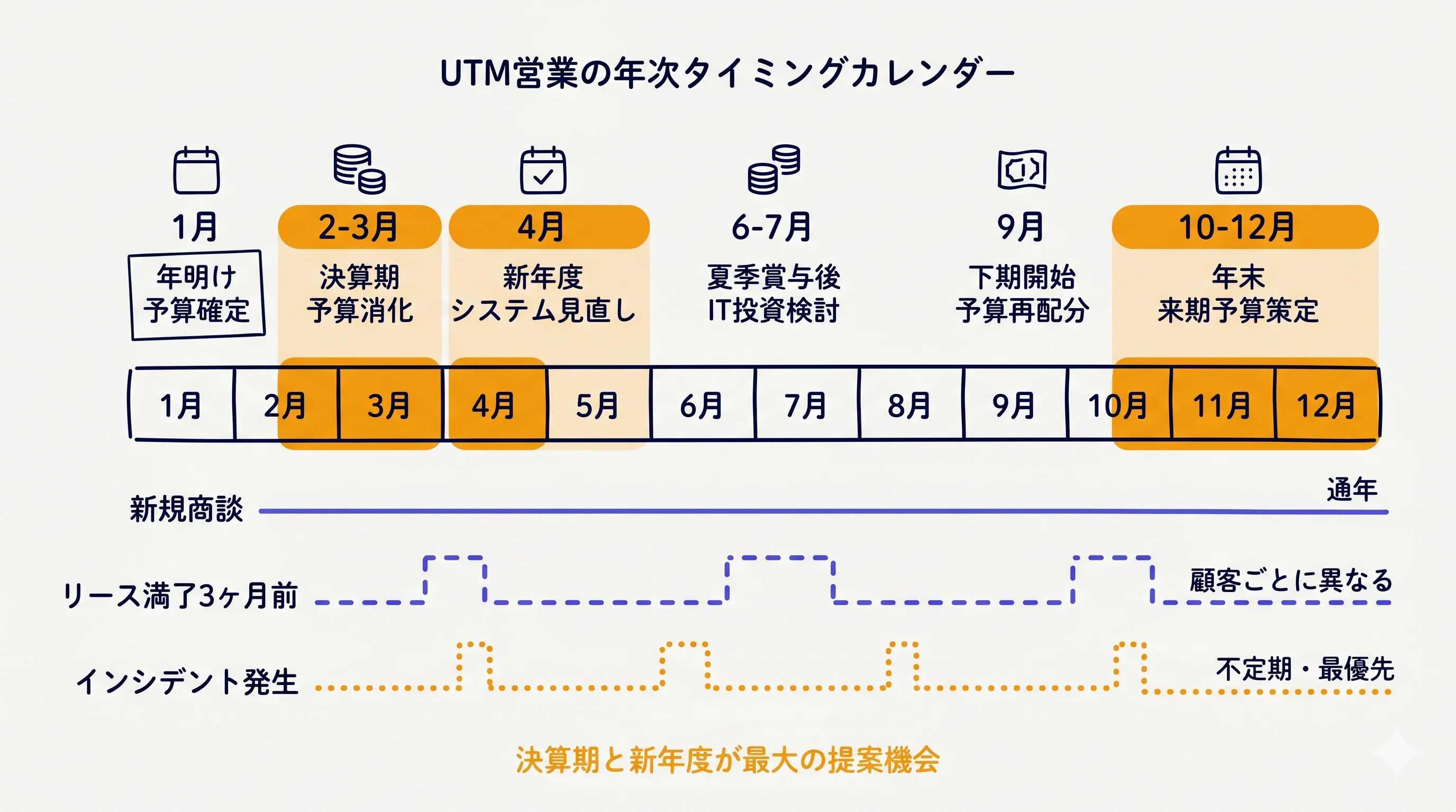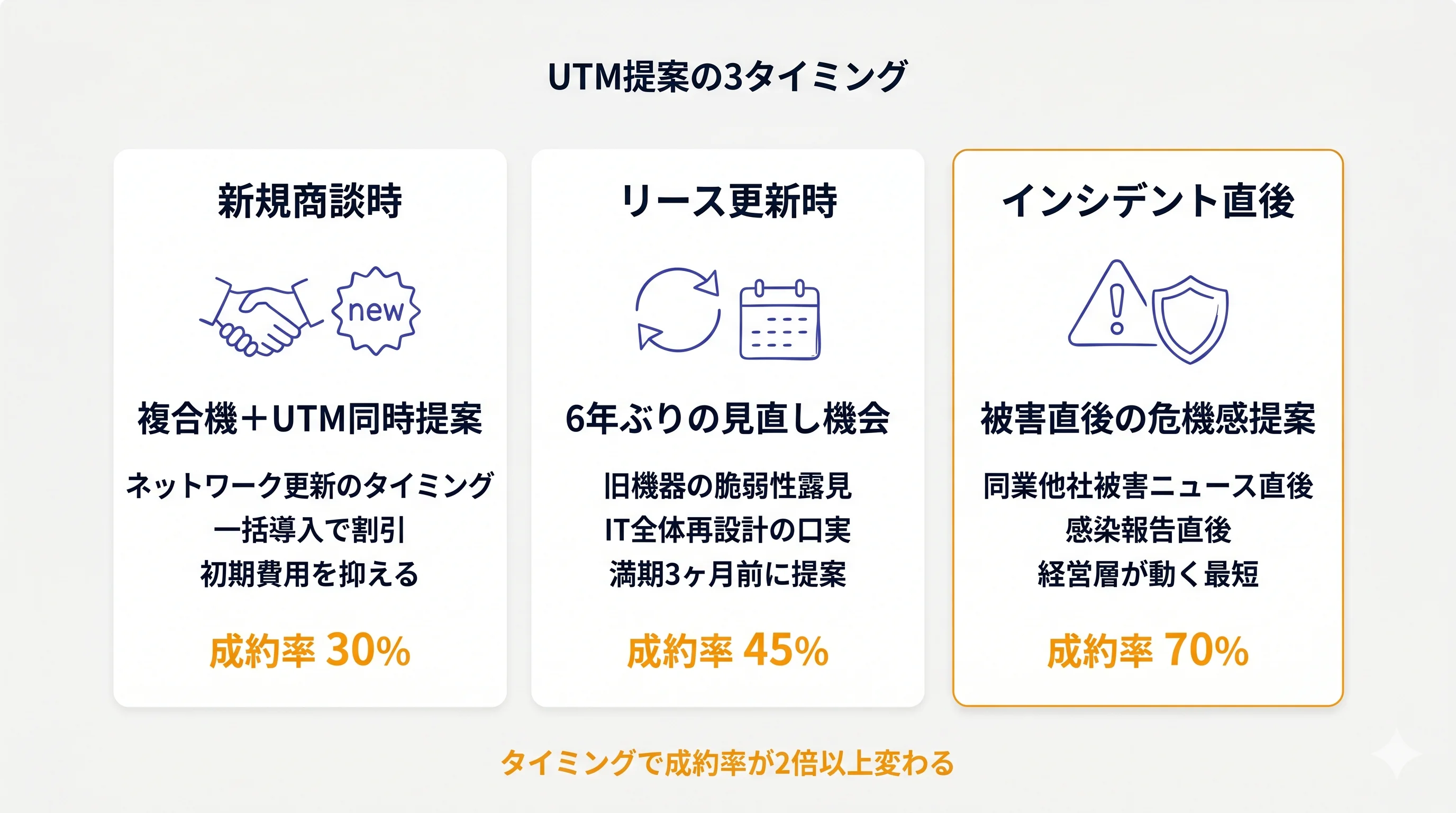 他社顧客で実際にランサムウェア被害が出たニュース時や、取引先経由の感染事例が報じられた直後はUTM提案のゴールデンタイムです。「他人事ではない」という危機感が顧客の意思決定を加速させます。