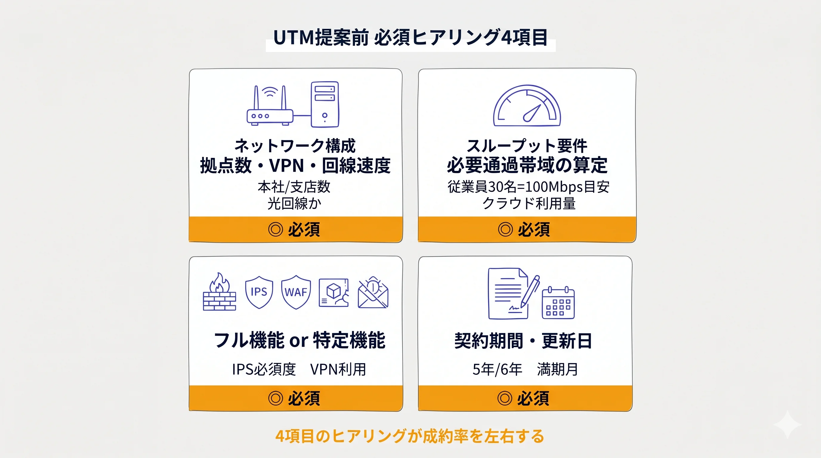 本社のみか複数拠点か、拠点間VPNが必要かを確認。拠点数が多いほどUTMのVPN機能が活きるため、提案価値が上がります。